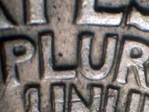 STATES OF AMERICA, E PLURIBUS, inside eagle's Right wing feathers, and