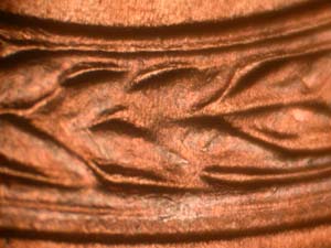 Description: Strong extra thickness on E PLURIBUS UNUM, both wheat ears and stems, AMERICA, and STATES. Reported by: James Wiles Comments: Broken R in LIBERTY. |