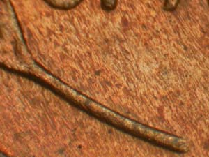 Description: Medium spread on UNUM and upper wheat ears with extra thickness on stems, ONE, STATES, and AMERICA. Reported by: James Wiles Comments: Obverse is MMS-002 (small mintmark). |