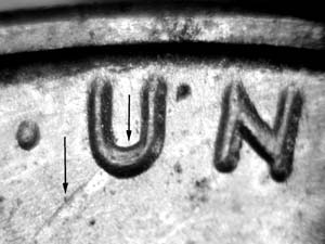 Description: Very light spread on outside lower Left wheat with extra thickness on E PLURIBUS UNUM and outside Right wheat. Reported by: Bill McMurray Comments: Same Obverse die as DDR-007c. I need to see a specimen of this doubled die for new color photos and die stage information. |