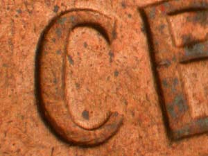 Description: Strong spread on ONE CENT, with rotational spread on UNITED STATES OF AMERICA as strong notches on the upper Left letters. Reported by: B. J. Neff Comments: |