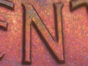 Description: Medium spread on UNITED STATES OF AMERICA, E PLURIBUS UNUM, and designer's initials, with light spread on CENT. Reported by: James Wiles Comments: Proof. |