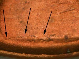 | Die Crack over V. D. B. | Die Crack from Left Wheat to Rim | Die Scratches though T of CENT | ||||||||||||||||