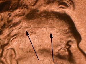 | Die Crack over V. D. B. | Die Crack on lower Lapel | Die Chip on T of CENT | ||||||||||||||||