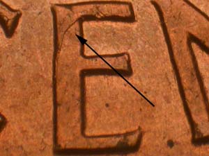 | Die Crack on E of ONE | Die Chip on E of CENT | |||||||||||||||||||||||||