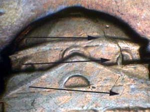 | Die Crack South from Right Dome | Die Crack between Pillars # 3 and # 4 | Die Crack from Steps to T of CENTS | ||||||||||||||||