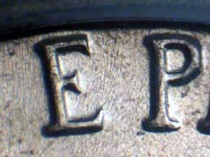 Description: Light spread on E PLURIBUS UNUM, UNITED STATES, and FIVE decreasing from Left to Right. Reported by: Jim Hale Comments: |