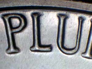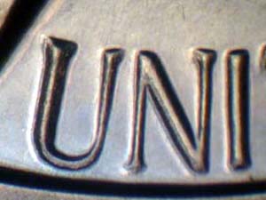 Description: Light triple spread on E PLURIBUS UNUM with medium spread on UNITED