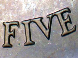 Description: Light spread on E PLURIBUS UNUM, UNITED STATES OF AMERICA, and FIVE CENTS,. with extra thickness on UNUM. Reported by: David Hardin Comments: Reverse is RDV-006 (strong railings). |