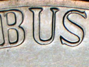 Description: Medium spread and extra thickness on E PLURIBUS UNUM, OF AMERICA, and Right building. Reported by: Timothy Wissert Comments: Reverse is RDV-006 (strong railings). |