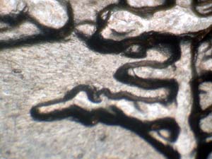| Larger Die Chip in Designer's Initials | Die Gouge Dot in Upper 2 of Date | |||||||||||||||||||||