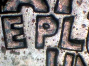 Description: Strong extra thickness on UNITED STATES OF AMERICA, E PLURIBUS UNUM, and eagle's plume. Reported by: Michael L. Ellis Comments: Reverse is RDV-002. |