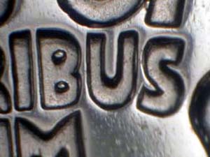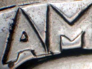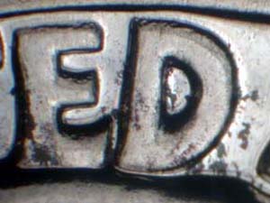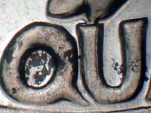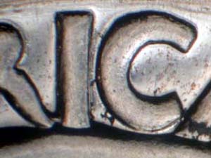 Description: Light extra thickness on UNITED STATES OF with split serifs on AMERICA. Reported by: Lee Hiemke Comments: Proof. |