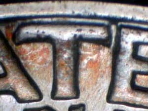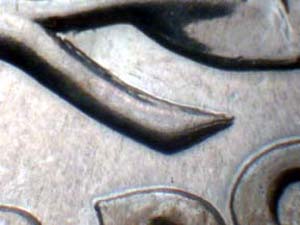 Description: Light spread on both stems, QUARTER DOLLAR, ERICA of AMERICA, and lower Left wing. Reported by: Delma K. Romines Comments: Proof. |