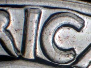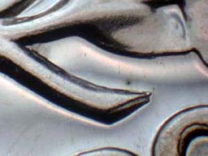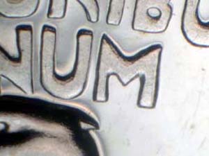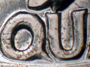 Description: Very strong spread on QUARTER DOLLAR, wreath, stem ends, lower wings, UNITED STATES OF AMERICA and with light spread on E PLURIBUS UNUM. Reported by: Delma K. Romines Comments: FS-801. |