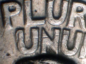 STATES OF AMERICA, E PLURIBUS, inside eagle's Right wing feathers, and