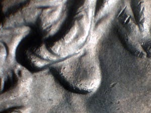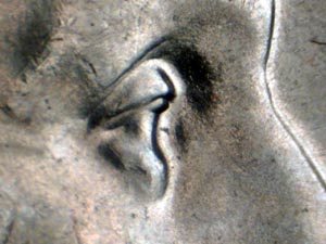 nostril, with medium spread on eye, and light spread on hair curl above