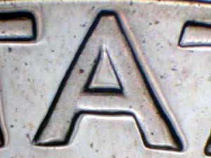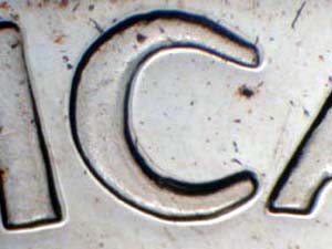 Description: Medium spread on E PLURIBUS UNUM, UNITED STATES OF AMERICA, HALF DOLLAR, and eagle's feathers. Reported by: James Wiles Comments: |