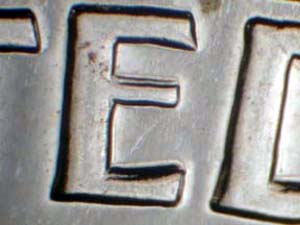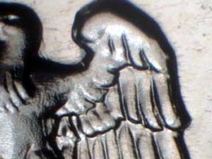 Description: Light spread on E PLUR of PLURIBUS, UN of UNUM, U and ED of UNITED, AR of DOLLAR, with rotation on ES of STATES, OF and AMERICA, and tail feathers, with triple spread on the of middle bar of the F of HALF. Reported by: Timothy Wissert Comments: |