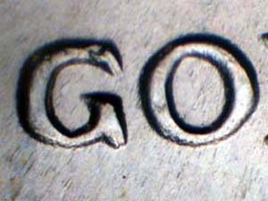 Description: Medium spread on IN GOD WE TRUST with light spread on chin, eye, and RTY of LIBERTY including the hair under the R of LIBERTY. Reported by: Geoffrey Fults Comments: BS. |