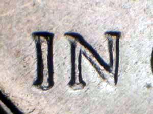 Description: Strong spread on profile, eye, hair above forehead, ear, and designer's initials, and medium spread on IN GOD with CW rotation on LIB of LIBERTY. Reported by: Ken Potter Comments: BS. |