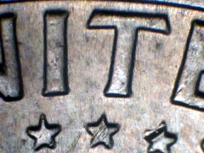 Description: Medium spread on stars under STATES OF and stars between the rays with light spread on stars behind eagle's head. Reported by: Timothy Wissert Comments: ODV-002/RDV-002 (Flared G). |