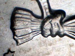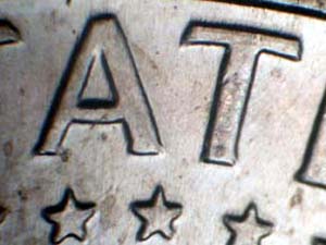 Description: Light spread on STATES OF AMERICA, stars under those letters, and stars between the rays. Reported by: Timothy Wissert Comments: ODV-002/RDV-002 (Flared G). |