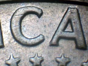 Description: Strong spread on STATES OF AMERICA and all the stars in the circle with medium spread on the stars between the rays. Reported by: Larry Nienaber Comments: BS. |