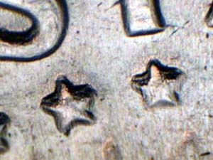 Description: Strong spread and extra thickness on HALF DOLLAR, UNITED STATES OF AMERICA, all the stars in the circle, arrows, designer's initials, clouds, and stars between the rays. Reported by: Ken Glickman Comments: ODV-002. |