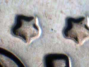 Description: Light spread and extra thickness on AMERICA and the stars under it, DOLLAR and the stars over it, and the arrows. Reported by: Timothy Clough Comments: |