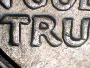 Description: Medium spread on LIBER of LIBERTY, IN GOD WE TRUST, and triple spread on 1 of date. Reported by: Timothy Wissert Comments: Reverse is RDV-001. |